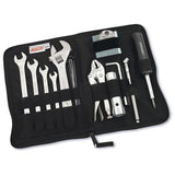 A high-quality upgrade from an OEM toolkit for motorcycle, ATV, and snow, the M1 provides combination wrenches, an adjustable wrench, locking pliers, 6-in-1 screwdriver, spark plug wrench, tire gauge, duct tape, zip ties, mechanics wire, and a shop towel, all organized in a heavy-duty zipper pouch. Light weight and very compact for road or trail-side repairs and adjustments.